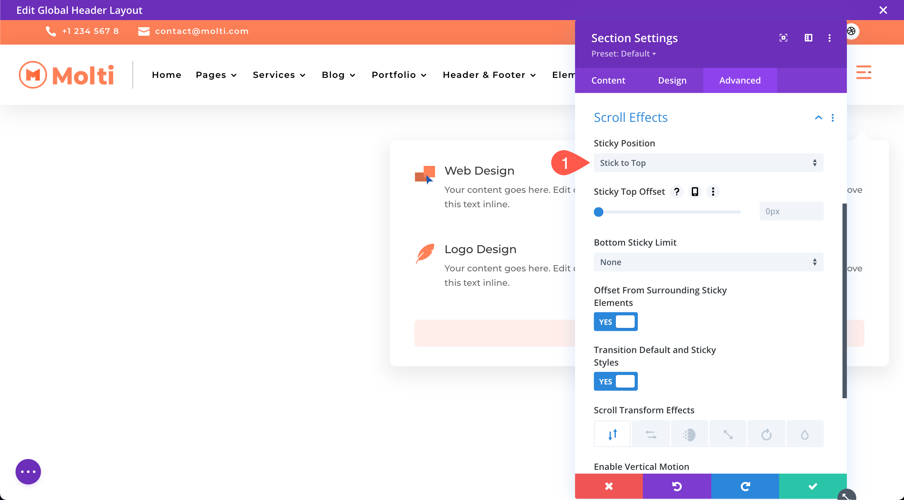 You can easily make your Molti Ecommerce Header Sticky on Scroll. For that, go to Divi -> Theme Builder -> Edit Global Header, and open the Section/Row Settings that you want to make sticky on Scroll. In the Settings go to Advanced Tab -> Scroll Effects -> Sticky Position -> Stick to Top. Then Save the Changes and check your Header on Frontend.